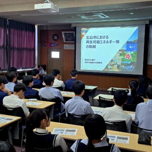 本日、2学年普通科キャリアアップコースの生徒たちが、産学連携講座の一環として長崎県五島市から熊川氏と中村氏をお招きして、「五島市における再生可能エネルギー等の取り組み」についての講演を実施しました。