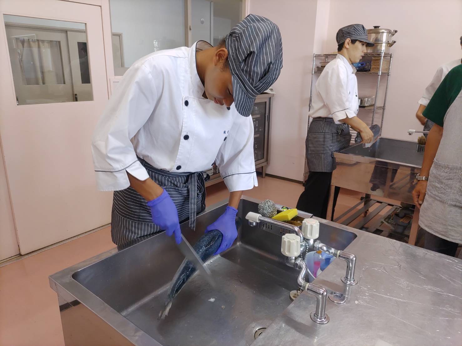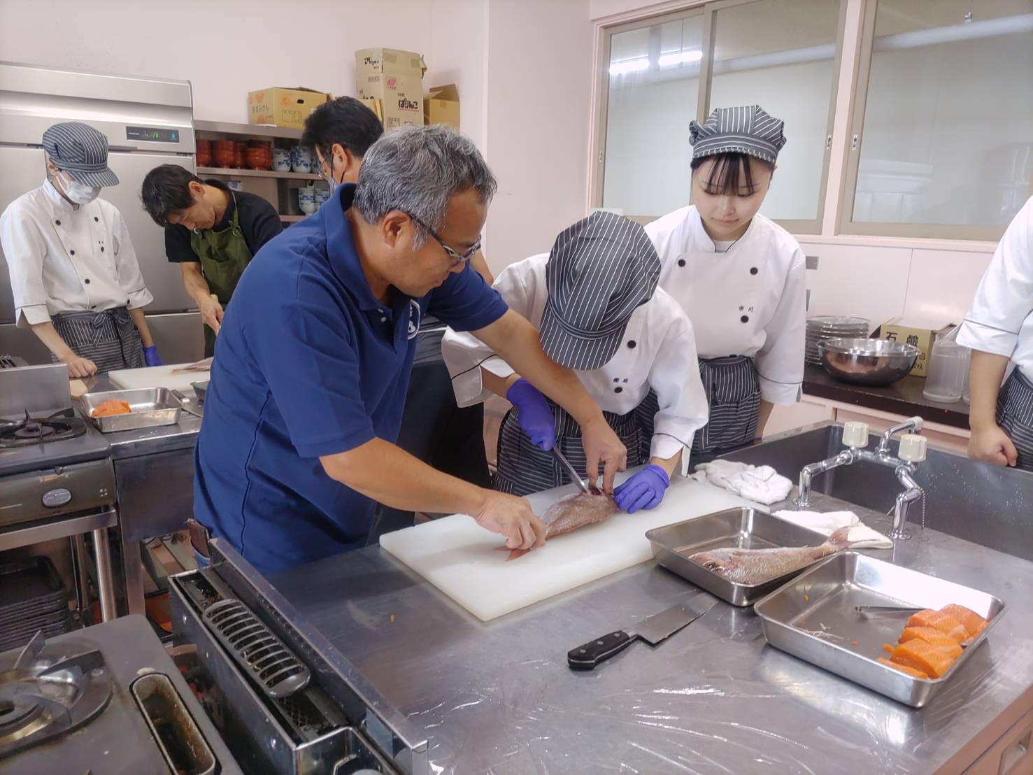 東青漁業士会の漁師13名が来校し、漁師の皆さんが漁獲した鯛とムール貝、日本サーモンファームさんから提供を受けた青森サーモンを使用しました。漁師の方々からコツを教わりながら丁寧にさばき、刺し身やポワレ、スープなどを完成させました。