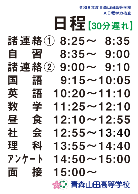 本日実施予定の一般入試A日程の開始時間について、交通状況により、開始時間を30分遅れの日程に変更いたします。