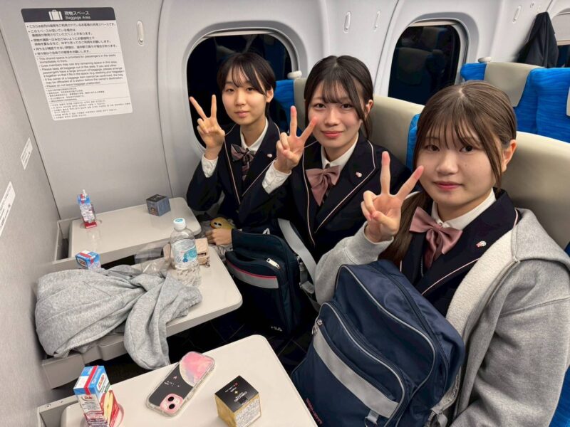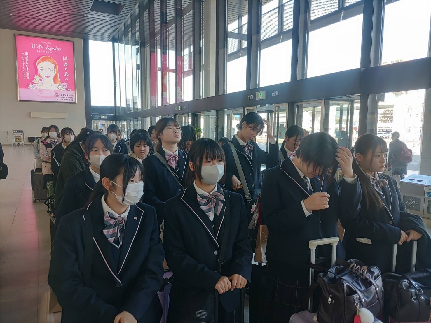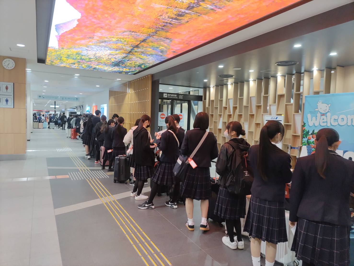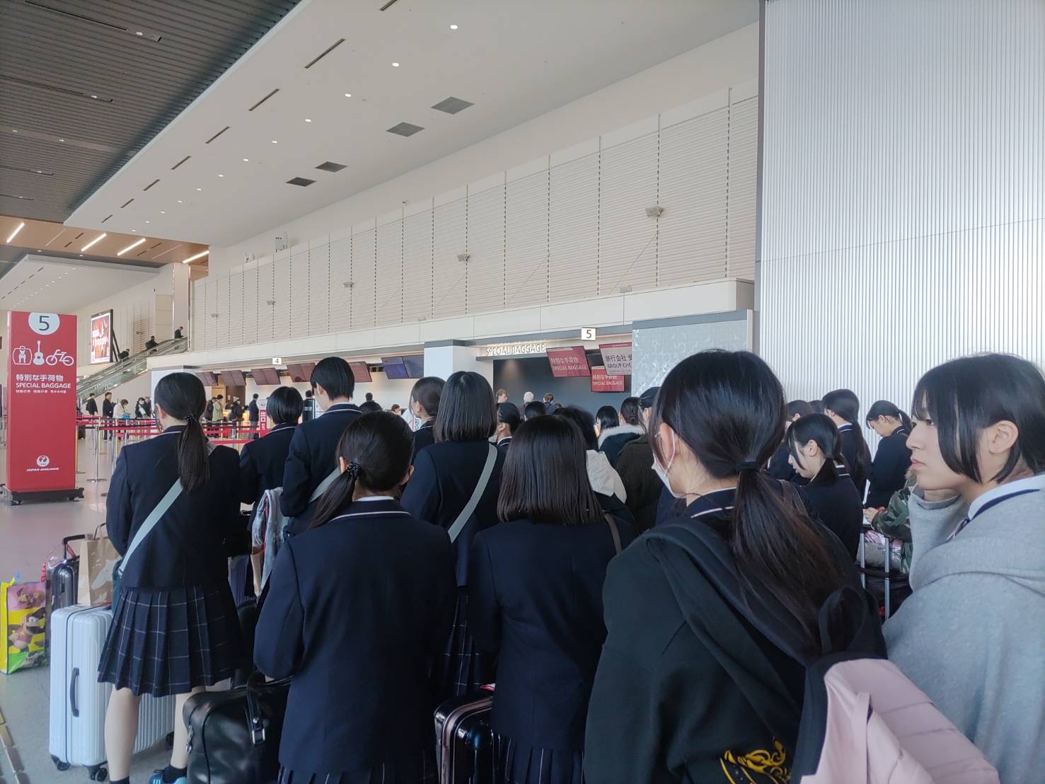 その後、伊丹空港から飛行機で青森へと向かいました。長い移動の中でも、仲間と過ごす時間を大切にしながら、無事に学校へ到着しました。