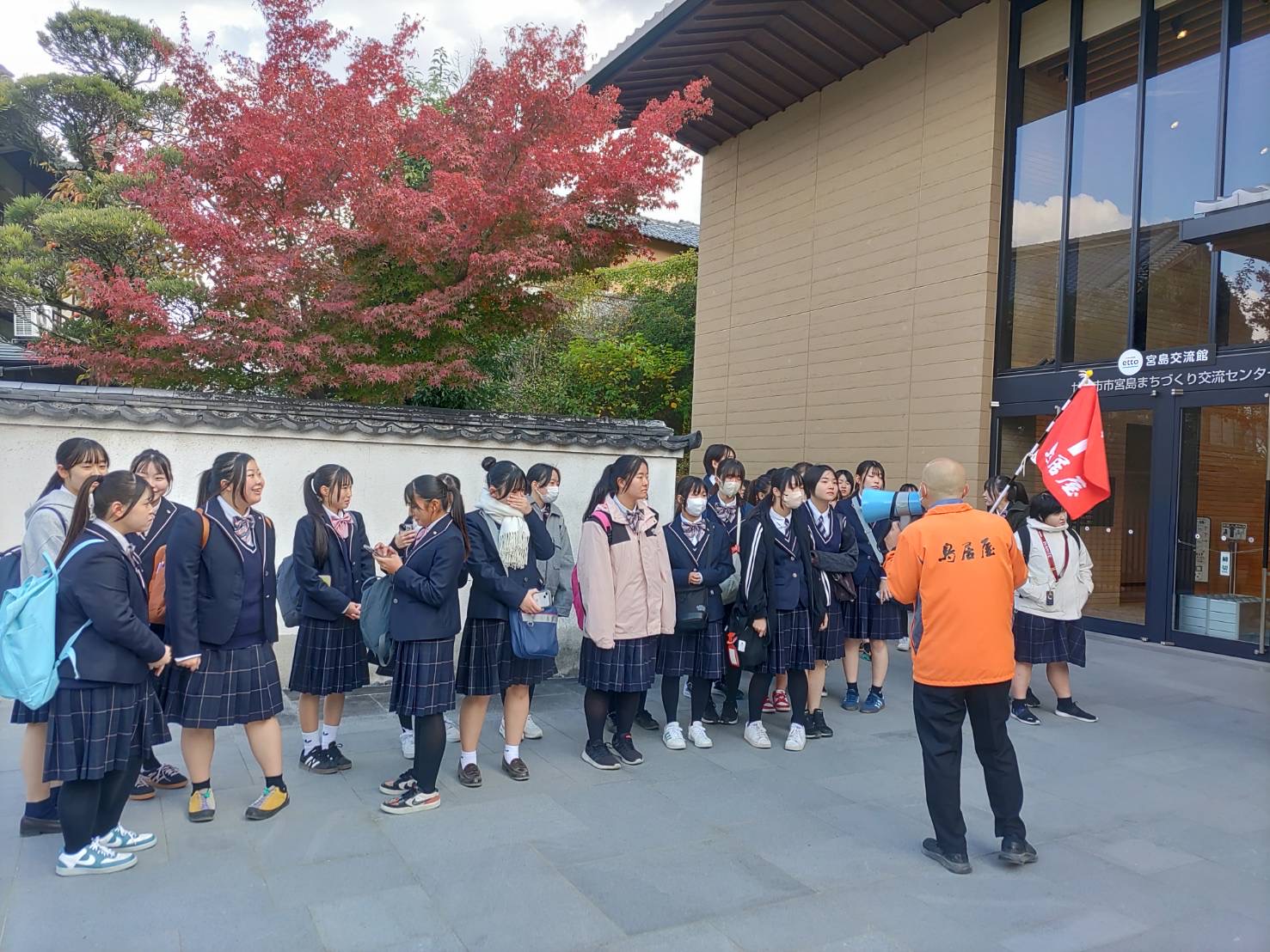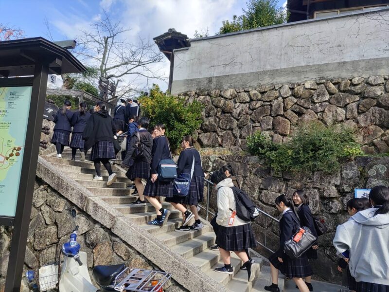本日は宿泊先を出発し、広島駅から京都へ移動しました。京都では班ごとに事前に計画した自主研修を行い、歴史ある街並みや寺社を巡りながら、普段の学習では味わえない体験をすることができました。班内で相談しながら移動したり、時間を意識して行動したりと、生徒たちの自主性がしっかりと発揮されていました。