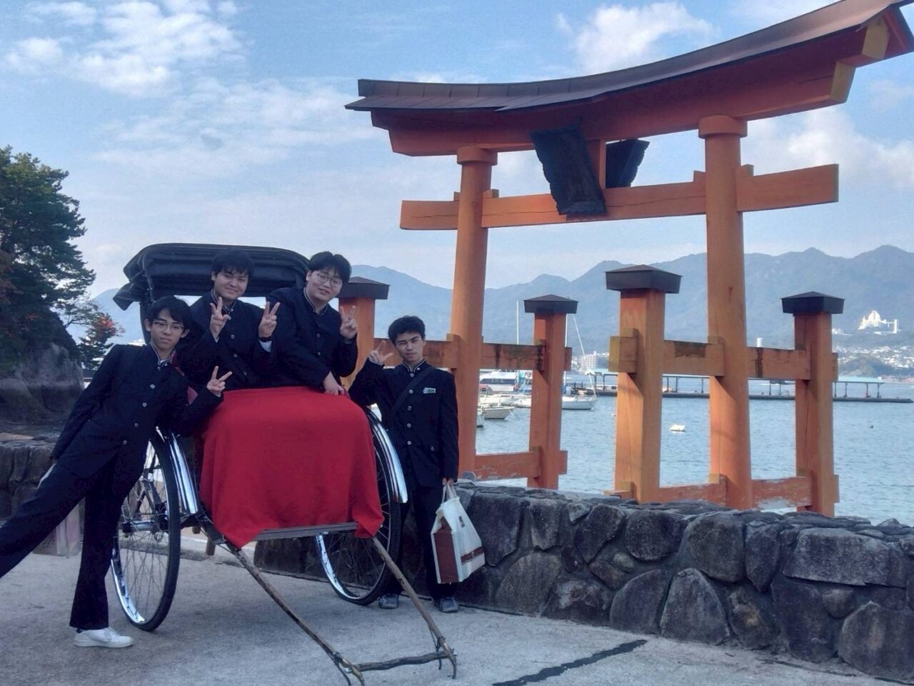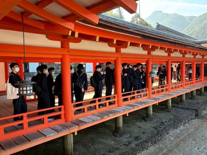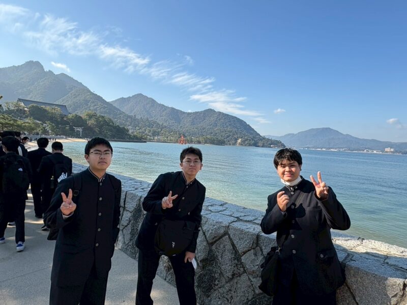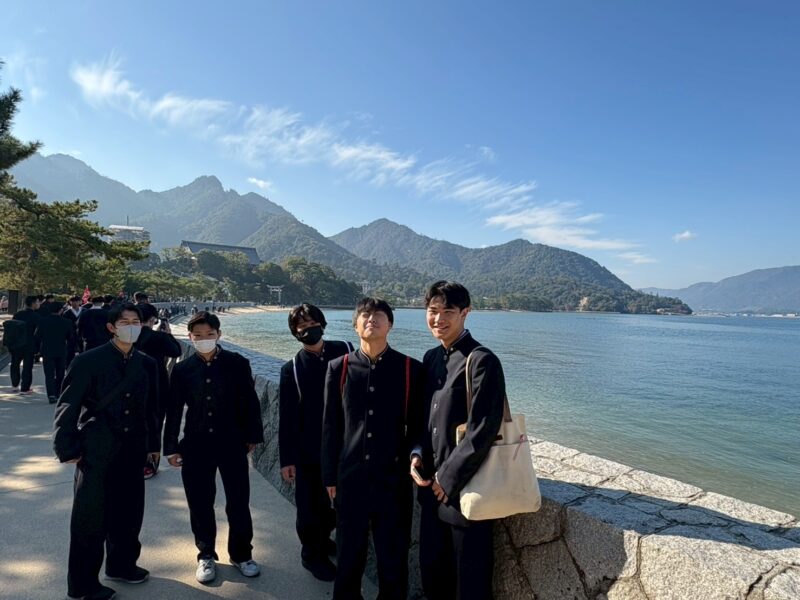 本日は、広島方面での研修を行いました。午前中は宮島を訪れ、世界遺産である厳島神社を見学しました。海に浮かぶ大鳥居は迫力があり、潮の満ち引きによって表情が変わる景観に心を奪われました。社殿の美しさや静かな雰囲気を通して、日本の伝統文化に触れる貴重な時間となりました。