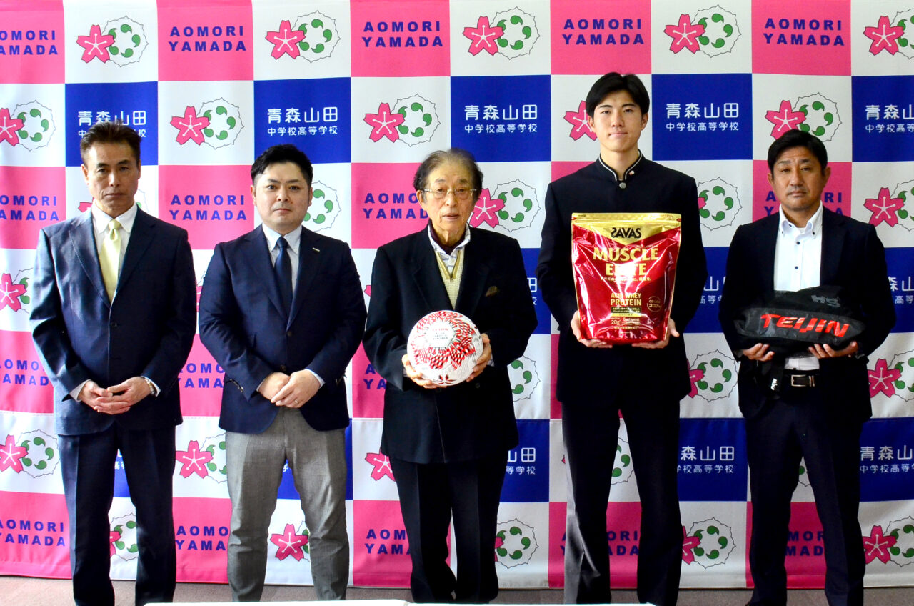 第104回全国高校サッカー選手権大会に出場する青森山田高等学校サッカー部に帝人ファーマ株式会社(teijin)、明治よりサッカーボールが10個、ボールケース、SAVASマッスルエリート3袋が贈呈されました。